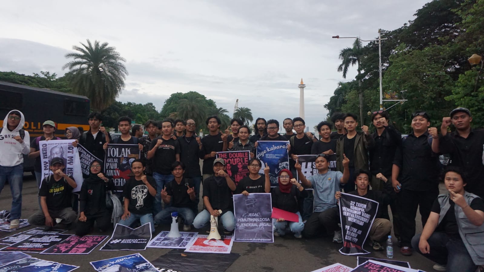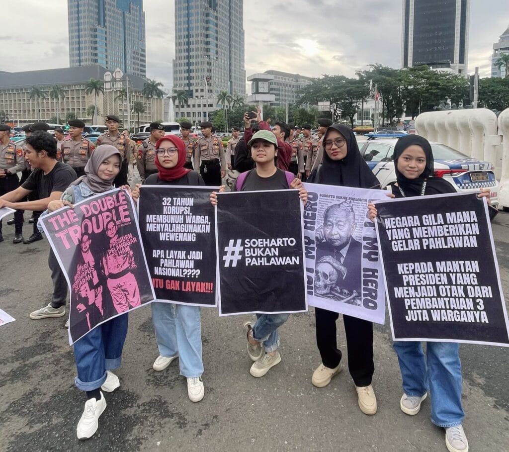 Jakarta, 14 November 2025 – Aliansi Ciputat Melawan Impunitas (ACMI) menggelar aksi demonstrasi di depan Istana Negara untuk menolak pemberian gelar pahlawan kepada Soeharto dan Sarwo Edhie Wibowo. Aksi ini diikuti oleh berbagai organisasi, di antaranya Forum Mahasiswa Ciputat (FORMACI), Komite Mahasiswa dan Pemuda Anti Kekerasan (KOMPAK), Mahasiswa Trojol Mania (Matraman), serta kawan-kawan yang membawa perspektif feminisme, termasuk Lingkar Studi Feminis (LSF) dan Puantara (Perempuan Tangerang Raya).