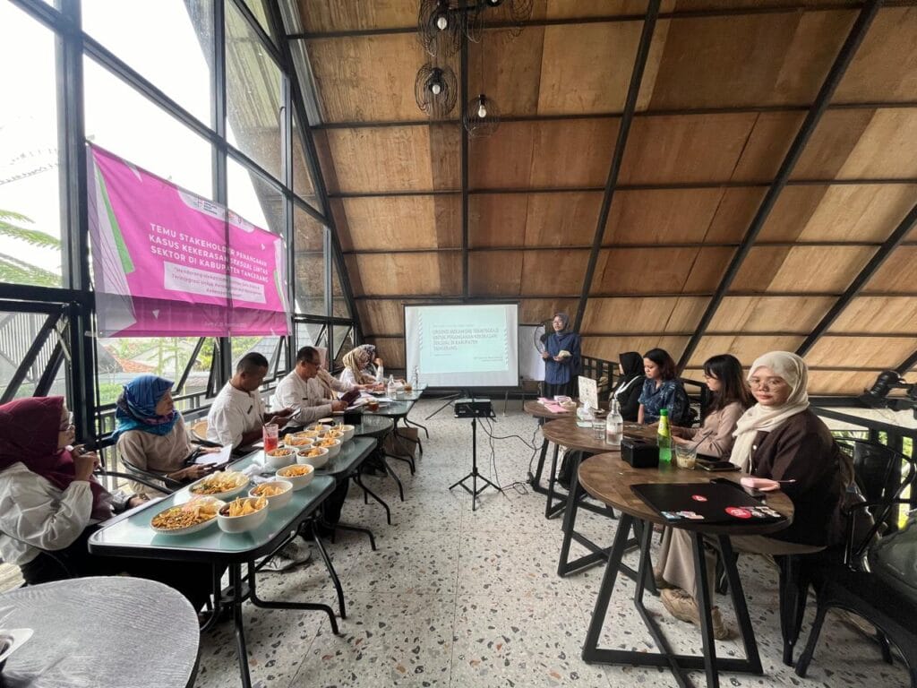 Lingkar Studi Feminis mengadakan temu pemangku kepentingan dengan organisasi pemerintah daerah di Kabupaten Tangerang dan titik fokus jaringan orang muda di Banten untuk mendorong mekanisme layanan terintegrasi dan penanganan kekerasan seksual di wilayah Kabupaten Tangerang yang bertempat di The Campus Resto, Tigaraksa, Kabupaten Tangerang, Jum’at (15/08/2025).